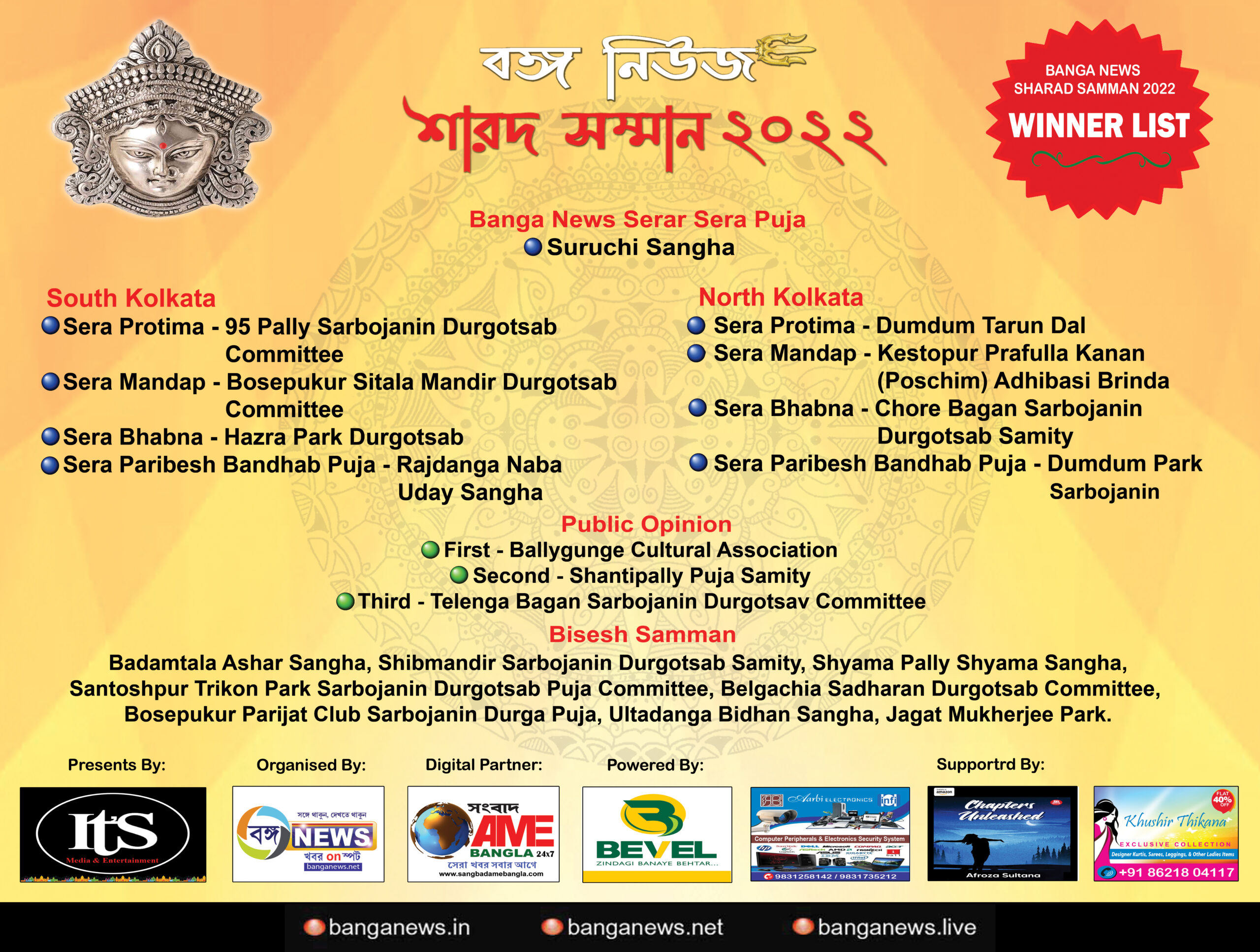 When we think about Durga Puja, the first city that comes to mind is Kolkata. In Kolkata, Durga Puja is the most awaited festival. Every year, Puja Committee has something special, innovative, and unique things to offer to the devotees. These Pandals deserve more than just a crowd. Banga News brings the exclusive opportunity for Puja Committee to be Awarded. On the occasion of Durga Puja, Its Media & Entertainment is organising a Mega Public Relation Event, âBanga News Sharad Sammanâ in Kolkata & its surroundings, this is keeping in mind the recognition of traditional artistry & publicity to the âCommon manâ. Through this initiative, the power of judgment is vested upon the city dwellers themselves, who can vote for their favorite pandals and make them win the coveted position of âThe Best Pujo in Kolkataâ. 3 Pujo Pandals with maximum votes are declared as the winner. Side by side our jury members also share their fair judgment to select the best puja of the year…