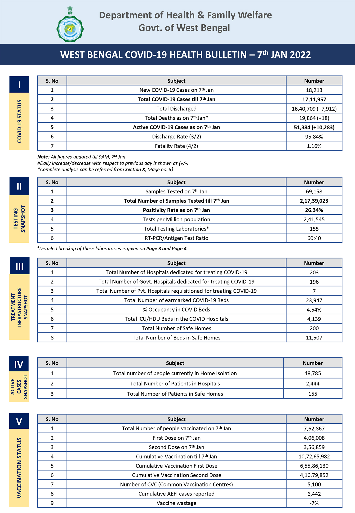 গত ২৪ ঘন্টায় রাজ্যে নতুন করে করোনায় আক্রান্ত হয়েছে ১৮ হাজার ২১৩ জন। যাঁদের মধ্যে ৭ হাজার ৪৮৪ জন কলকাতার বাসিন্দা। দ্বিতীয় স্থানে রয়েছে উত্তর ২৪ পরগনা (৩, ১১৮)। তৃতীয় স্থানে থাকা হাওড়ায় দৈনিক আক্রান্তের সংখ্যা ১ হাজার ৩৬০ জন। আর চিন্তা বাড়িয়ে হাজারের গন্ডি পার করল পশ্চিম বর্ধমানও ( ১,০৪৩)। সবমিলিয়ে এদিন রাজ্যে মোট করোনা আক্রান্তের সংখ্যা দাঁড়াল ১৭ লক্ষ ১১ হাজার ৯৫৭ জন। রাজ্যে মোট করোনা রোগী ১৭ লক্ষ ১১ হাজার ৯৫৭। মৃত্যু হয়েছে মোট ১৯, ৮৬৪ জনের। তার মধ্যে গত ২৪ ঘণ্টায় মৃত্যু হয়েছে ১৮ জনের। রাজ্যে সুস্থ রোগীর সংখ্যা ১৬, ৪০,৭০৯। সুস্থতার হার ৯৫.৮৪ শতাংশ। গত ২৪ ঘণ্টায় ৬৯,১৫৮ টি নমুনা পরীক্ষার মধ্যে ২৬.৩৪ শতাংশ রিপোর্টই পজিটিভ।