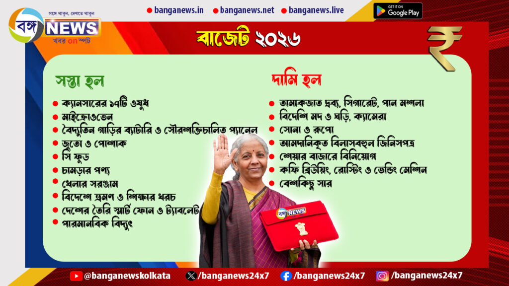 রবিবার নবম বাজেটে পেশ করেছেন নির্মলা। ৮৫ মিনিটের বাজেটে বেশ কিছু বড় ঘোষণা করেছেন। তবে কোন কোন জিনিস সস্তা হলো, আর দাম বাড়ল কোন কোন পণ্যের, সেই দিকেই নজর ছিল সাধারণ মানুষের।