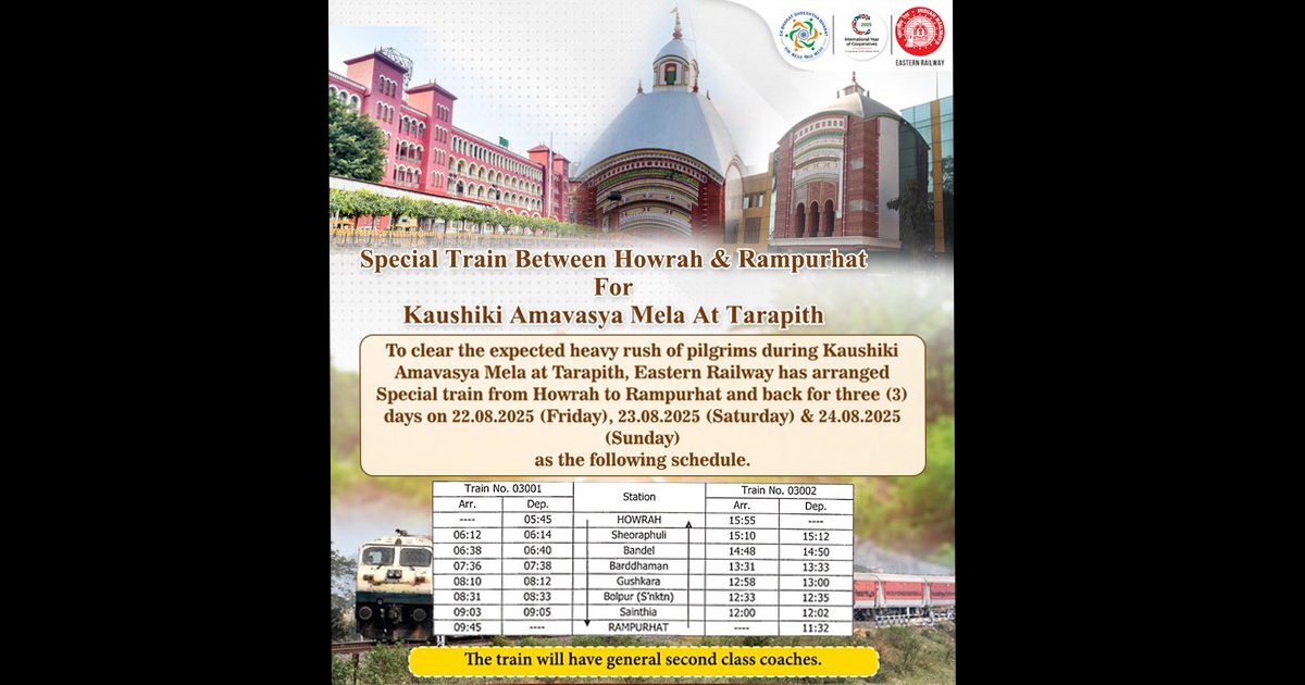 শনিবার কৌশিকী অমাবস্যা। তারাপীঠে এই অমাবস্যায় পুজোর জন্য অতিরিক্ত ভিড় করেন ভক্তেরা। এই অতিরিক্ত ভিড় সামাল দিতেই হাওড়া থেকে রামপুরহাট পর্যন্ত বিশেষ ট্রেন চালাবে পূর্ব রেল কর্তৃপক্ষ। শুক্রবার থেকে রবিবার পর্যন্ত চলবে বিশেষ এই ট্রেন। বুধবারই বিজ্ঞপ্তি দিয়ে এই কথা জানানো হয়েছে পূর্ব রেলের তরফে। রাজ্যের অন্যতম প্রধান তীর্থক্ষেত্র তারাপীঠ। এই শক্তিপীঠে এখন প্রতি দিনই ভক্তদের ভিড়। তবে, কৌশিকী অমাবস্যা তিথিতে এই ভিড় অনেক বেড়ে যায়। কয়েক লক্ষ ভক্তের সমাগম হয় মহাপীঠ তারাপীঠে। ইতিমধ্যেই সেখানকার প্রায় সব হোটেলের রুম বুকড হয়ে গিয়েছে। রামপুরহাট এবং আশেপাশের এলাকাতেও হোটেলের রুম খালি নেই বললেই চলে। এই অতিরিক্ত ভিড় সামাল দেওয়ার জন্য প্রস্তুতি শুরু করেছে রামপুরহাটের পুলিশ এবং প্রশাসন। অন্য দিকে, এই বাড়তি ভিড়ের কথা মাথায় রেখেই তিন দিন অতিরিক্ত একটি ট্রেন চালানোর সিদ্ধান্ত নিয়েছেন পূর্ব রেল কর্তৃপক্ষ। পূর্ব রেলের তরফে জানানো হয়েছে, কৌশিকী অমাবস্যায় যাত্রীদের অতিরিক্ত ভিড় সামাল দেওয়ার জন্য শুক্রবার থেকে রবিবার পর্যন্ত, হাওড়া থেকে রামপুরহাটের মধ্যে, ০৩০০১/০৩০০২ স্পেশাল ট্রেন চালানো হবে। ০৩০০১ হাওড়া-রামপুরহাট স্পেশাল ট্রেন, ওই তিন দিন সকাল ৫টা ৪৫ মিনিটে হাওড়া থেকে ছাড়বে। সেই ট্রেন রামপুরহাট পৌঁছবে সকাল ৯টা ৪৫ মিনিটে। অন্যদিকে, ০৩০০২ রামপুরহাট-হাওড়া স্পেশাল ট্রেনটি সকাল ১১টা ৩২ মিনিটে রামপুরহাট ছেড়ে দুপুর ৩টে ৫৫ মিনিটে হাওড়া এসে পৌঁছবে। যাত্রাপথে শেওড়াফুলি, ব্যান্ডেল, বর্ধমান, ঘুষকরা, বোলপুর-শান্তিনিকেতন এবং সাঁইথিয়া স্টেশনে দাঁড়াবে ওই ট্রেনটি। এই ট্রেনের সমস্ত কোচই সাধারণ দ্বিতীয় শ্রেণির হবে বলেও জানানো হয়েছে। তাতে কোনও আসন সংরক্ষিত থাকবে না।