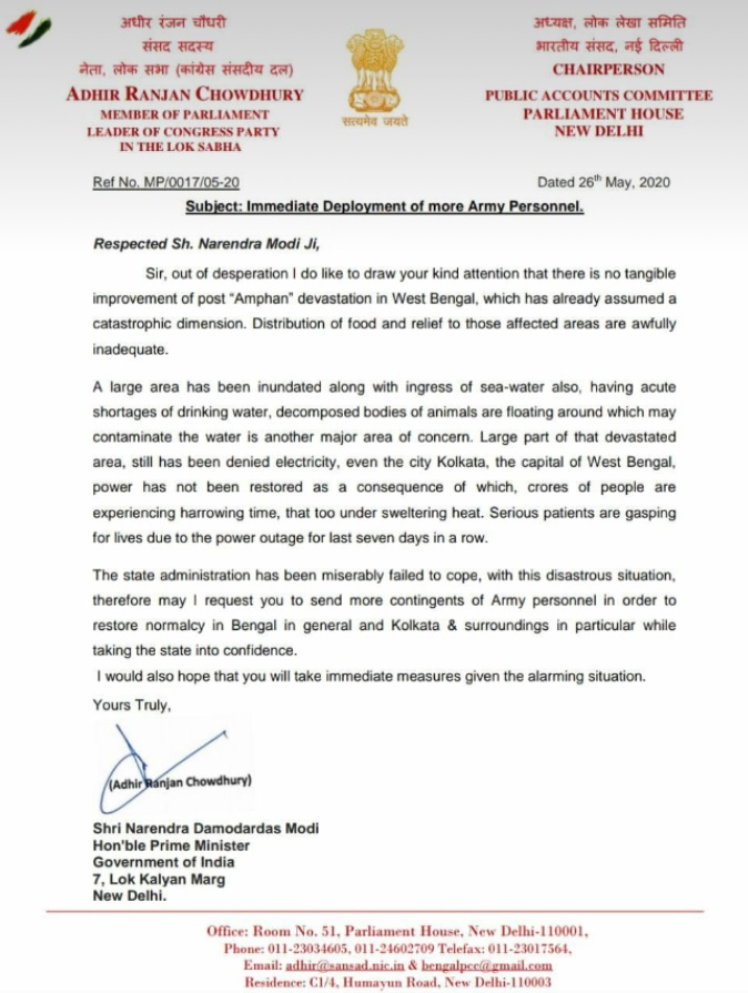 আমফান ক্ষতিগ্রস্ত এলাকাগুলিতে পুনর্নিমাণের কাজের জন্য আরও সেনা মোতায়েনের প্রয়োজন । তাই দ্রুত যাতে এই সমস্ত এলাকায় আরও সেনা আধিকারিকদের মোতায়েন করা হয়, তার আর্জি জানিয়ে প্রধানমন্ত্রী নরেন্দ্র মোদিকে চিঠি পাঠালেন অধীর রঞ্জন চৌধুরি । তিনি চিঠিতে লেখেন, “আমি হতাশ হয়ে আপনার মনসংযোগ করতে চাইছি । আমফানের জেরে পশ্চিমবঙ্গ বর্তমানে বিপর্যস্ত । ক্ষতিগ্রস্ত এলাকাগুলিতে যে সমস্ত ত্রাণ ও খাদ্য সামগ্রী পৌঁছে দেওয়া হচ্ছে, তা অপর্যাপ্ত ।” তিনি আরও লেখেন, “বিস্তীর্ণ এলাকাজুড়ে সমুদ্রের জল প্রবেশ করেছে । পানীয় জল পাওয়া যাচ্ছে না । প্রাণীদের পচা-গলা দেহ জলের মধ্যে ভেসে বেড়াচ্ছে । বিপর্যস্ত এলাকাগুলির বহু জায়গায় বিদ্যুৎ সংযোগ নেই । এমন কী, পশ্চিমবঙ্গে রাজধানী কলকাতা শহরেও বেশ কিছু এলাকায় বিদ্যুৎ সংযোগ এখনও বিচ্ছিন্ন রয়েছে । কোটি কোটি মানুষ কঠিন সময়ের মধ্যে দিয়ে যাচ্ছে । সাত দিন হতে চলল অনেক জায়গায় এখনও বিদ্যুৎ না আসায় মানুষ এবার অধৈর্য্য হয়ে পড়ছে ।”প্রশাসন পুনর্নির্মাণ কাজে ব্যর্থ বলেই মনে করছেন অধীর চৌধুরি । তিনি চিঠিতে তা উল্লেখও করেন । লেখেন, “বিপর্যস্ত পরিস্থিতি সামলাতে ব্যর্থ রাজ্য প্রশাসন । তাই আমি আপনাকে অনুরোধ করছি, কলকাতা ও শহরতলি-সহ বাংলাকে স্বাভাবিক ছন্দে ফেরাতে আরও সেনাবাহিনী পাঠান । উদ্বেগজনক পরিস্থিতি সামাল দিতে আপনি দ্রুত উপযুক্ত ব্যবস্থা নেবেন বলে আমি আশা করছি ।”
