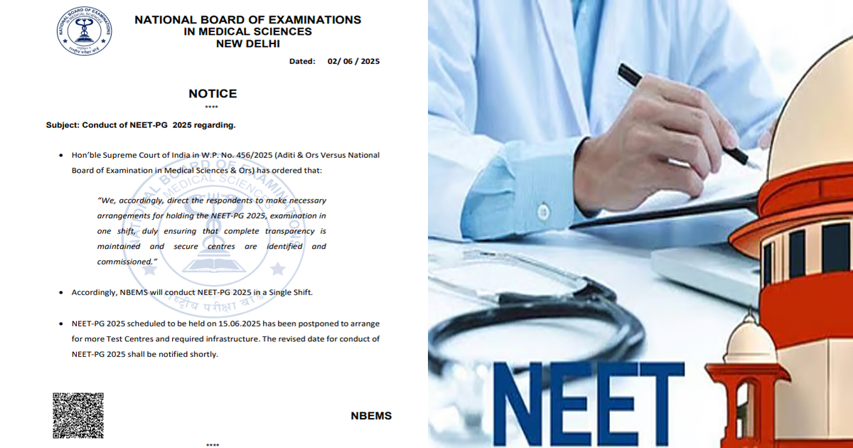 ন্যাশনাল এলিজিবিলিটি কাম এন্ট্রান্স টেস্ট পোস্ট গ্র্যাজুয়েশন-এর পরীক্ষা স্থগিত করা হল ৷ এবারের NEET PG-2025 পরীক্ষা হওয়ার কথা ছিল আগামী ১৫ জুন ৷ কিন্তু ওইদিন পরীক্ষা হচ্ছে না-বলে বিজ্ঞপ্তি জারি করে জানিয়ে দিল ন্যাশনাল বোর্ড অফ এক্সামিনেশনস ইন মেডিক্যাল সায়েন্সেস ৷ পরীক্ষার্থীদের পরামর্শ দেওয়া হচ্ছে যেন তারা NBEMS-এর অফিসিয়াল ওয়েবসাইট নিয়মিত নজর রাখেন ৷ আগের দিনক্ষণ অনুযায়ী অর্থাৎ ১৫ জুন নিট পিজি-র পরীক্ষা দু’টি শিফটে পরীক্ষার ব্যবস্থা করা হয়েছিল। দু’টি শিফটে পরীক্ষা নেওয়ার বিষয়টির বিরোধিতা করে সুপ্রিম কোর্টের দ্বারস্থ হয়েছিলেন জুনিয়র চিকিৎসকদের একাংশ। এরপরই দু’টি শিফটের পরীক্ষার আর্জি খারিজ করে দেয় দেশের শীর্ষ আদালত ৷ দিনক’য়েক আগেই সুপ্রিম কোর্ট নির্দেশ দেয় একটি শিফটে পরীক্ষা নিতে হবে। সেইসঙ্গে আরও নির্দেশ দেওয়া হয়, পরীক্ষা যাতে সম্পূর্ণ স্বচ্ছতা বজায় রাখা হয় ও নিরাপদ কেন্দ্র নির্বাচন ও পরিচালনা করা হয়। তাই বোর্ডের তরফে ডাক্তারির স্নাতকোত্তর স্তরের প্রবেশিকা পরীক্ষা পিছিয়ে দেওয়া হল ৷ NBEMS এদিন জানিয়েছে, “সুপ্রিম নির্দেশনার পরিপ্রেক্ষিতে, NEET PG 2025 পরীক্ষা একটি শিফটে অনুষ্ঠিত হবে। 15 জুন নির্ধারিত এই পরীক্ষাটি এখন স্থগিত করা হয়েছে যাতে অতিরিক্ত পরীক্ষাকেন্দ্র ও প্রয়োজনীয় অবকাঠামো প্রস্তুত করা যায়। পরীক্ষার নতুন তারিখ খুব শীঘ্রই ঘোষণা করা হবে।”