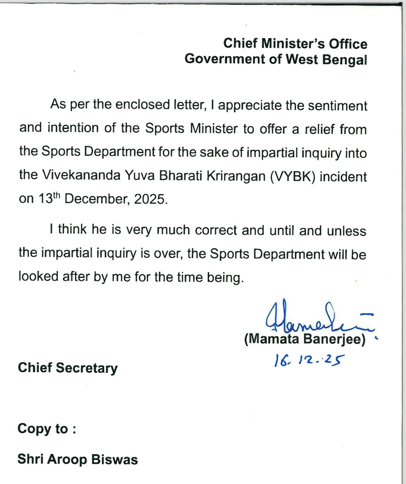 জল্পনাই সত্যি হলো। গৃহীত হলো অরূপ বিশ্বাসের ইস্তফাপত্র। ক্রীড়ামন্ত্রীর পদ থেকে অরূপ বিশ্বাসের পদত্যাগের ইচ্ছায় সম্মতি দিয়েছেন মুখ্যমন্ত্রী মমতা বন্দ্যোপাধ্যায়। আপাতত ক্রীড়াদপ্তর মমতা বন্দ্যোপাধ্যায় নিজের হাতেই রাখবেন। তদন্ত শেষ না হওয়া পর্যন্ত অব্যাহতি দেওয়া হলো অরূপকে। মঙ্গলবার সকালেই সোশ্যাল মিডিয়ায় অরূপ বিশ্বাসের লেখা একটি চিঠি ভাইরাল হয়। ‘শ্রদ্ধেয় দিদি’কে সেই চিঠিতে লেখা ছিল, ১৩ ডিসেম্বর মেসির কলকাতা সফরে যুবভারতী ক্রীড়াঙ্গনে যে পরিস্থিতি হয়েছে, তার জন্য ইতিমধ্যেই তদন্ত কমিটি গঠন করা হয়েছে। ‘নিরপেক্ষ তদন্তের স্বার্থে আমি ক্রীড়ামন্ত্রী হিসেবে অব্যাহতি চাইছি। আশা করি আমার এই অনুরোধ রাখবেন।’ অরূপের সেই অনুরোধ গৃহীত হয়েছে। আপাতত ক্রীড়া দপ্তর দেখবেন মমতা বন্দ্যোপাধ্যায় নিজে। এর আগে মদন মিত্র সারদা মামলায় যখন গ্রেপ্তার হন, মদন ক্রীড়ামন্ত্রী ছিলেন। গ্রেপ্তারের পরে বছরখানেক সেই পদে থাকলেও পরবর্তীকালে মদনকে সরিয়ে সেই দপ্তরের দায়িত্ব নেন মমতা নিজে। এ বার যুবভারতী কাণ্ডে অরূপের সরে দাঁড়ানোর পরে আবারও ক্রীড়া দপ্তরের দায়িত্বে মমতা বন্দ্যোপাধ্যায়। ১৩ ডিসেম্বর যুবভারতীর ঘটনায় যে ভাবে বাংলার মাথা হেঁট হয়েছে, তাতে সরকারের ভূমিকাও প্রশ্নের মুখে পড়েছে। মাঝ মাঠে মেসির সঙ্গে ছবি তুলতে চেয়ে মন্ত্রী, VVIP-দের লাফালাফি যেমন সমালোচনার মুখে, পাশাপাশি চরম বিশৃঙ্খলা নিয়েও তদন্ত চলছে। মঙ্গলবারই শোকজ়ের চিঠি ধরানো হয়েছে রাজ্য পুলিশের ডিজি রাজীব কুমার ও বিধাননগরের সিপি মুকেশ কুমারকে। রাজীব কুমারকে ২৪ ঘণ্টার মধ্যে জবাব দিতে বলা হয়েছে। সাসপেন্ড করা হয়েছে বিধাননগরের ডিসিপি অনীশ সরকারকেও। আপাতত চার সদস্যের SIT গঠন করে তদন্তের নির্দেশ দেওয়া হয়েছে।
