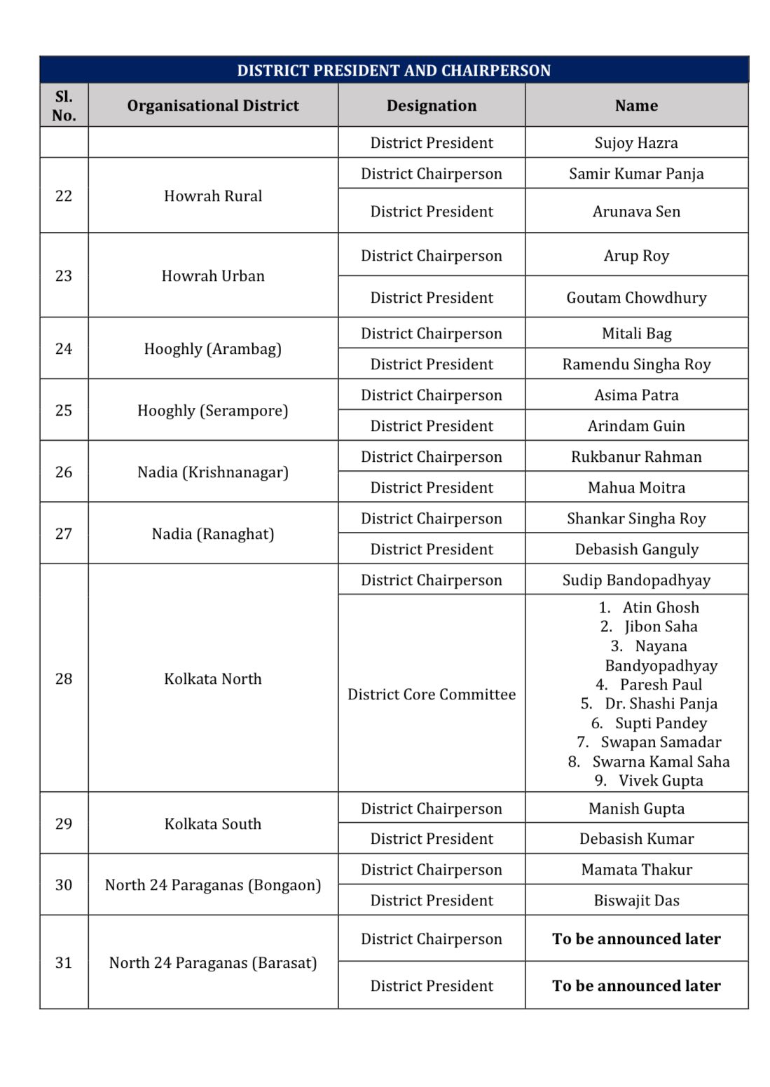 বীরভূমের রাজনীতিতে গুরুত্ব কমল অনুব্রত মণ্ডলের! জেলা সভাপতি নন, দায়িত্বে শুধুমাত্র কোর কমিটি। বস্তুত, বীরভূমের ধাঁচেই এবার কোর কমিটি উত্তর কলকাতাতেও। জেলা সভাপতি পদটি বিলুপ্ত করে সুদীপ বন্দ্যোপাধ্যায় করা হল চেয়ারপার্সন। বছর ঘুরলেই রাজ্যে বিধানসভা ভোট। তৃণমূলে কি রদবদল আসন্ন? জল্পনা চলছিলই। দলনেত্রী মমতা বন্দ্যোপাধ্যায়ের কাছে পারফরম্য়ান্সের ভিত্তিতে জেলা সভাপতি পদে রদবদলের তালিকাও পাঠিয়েছিলেন অভিষেক বন্দ্যোপাধ্যায়। এরপর চলতি বছরের ১০ ফেব্রুয়ারি তৃণমূল পরিষদীয় দলের সঙ্গে বৈঠক করেন মমতা বন্দ্যোপাধ্যায়। সূত্রের খবর, বৈঠকে যাঁরা নিজেদের বিধানসভা এলাকায় রদবদল চান, সেইসব বিধায়কদের ৩ জনের নাম জমা দেওয়ার নির্দেশ দেন তিনি। সময়সীমা ছিল ১৫ দিন। অবশেষে সেই রদবদল ঘটে গেল। নয়া জেলা সভাপতিদের তালিকা প্রকাশ করে দিল তৃণমূল।